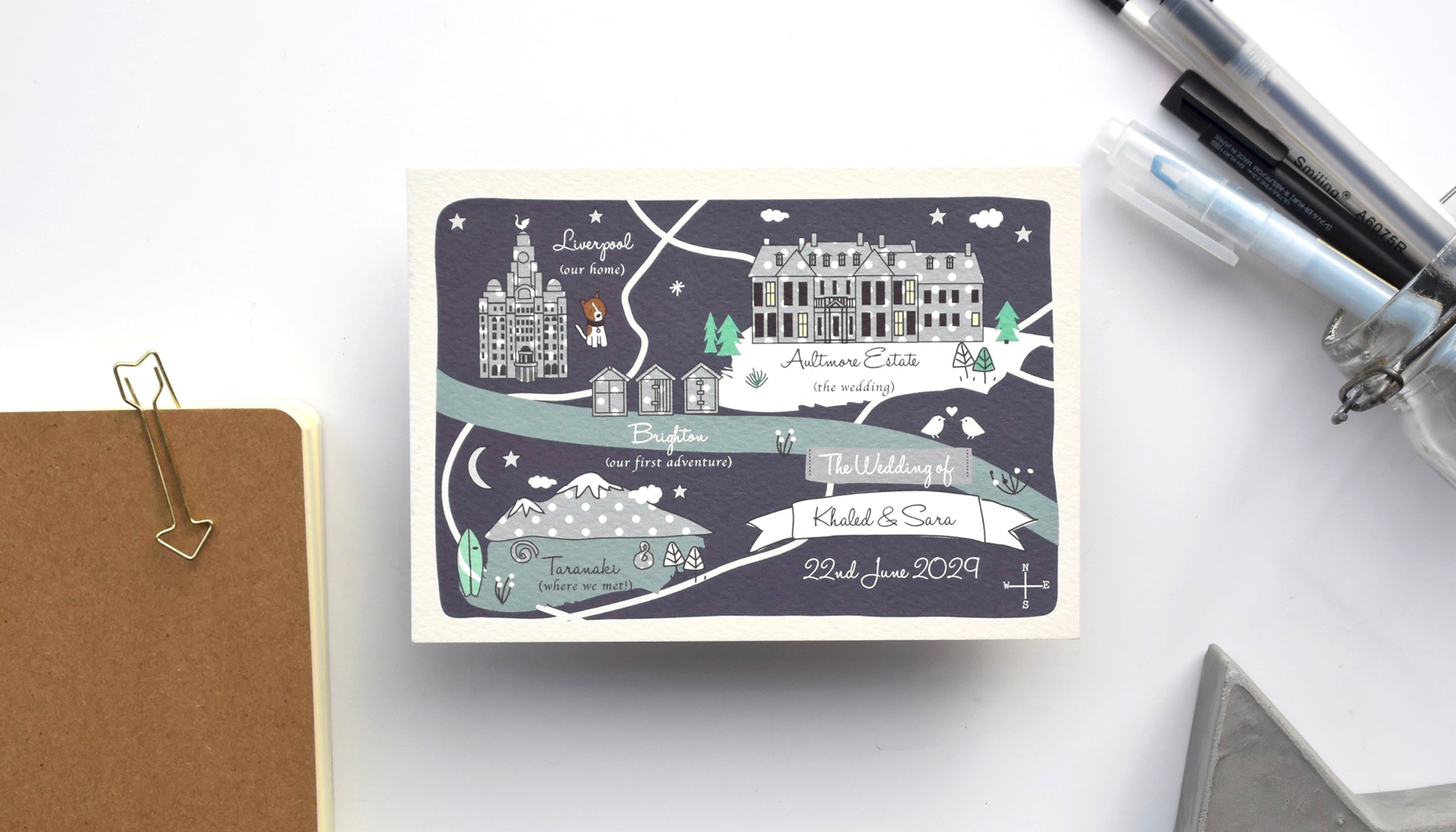Beautiful custom illustrated wedding invitations designed to your requirements.
