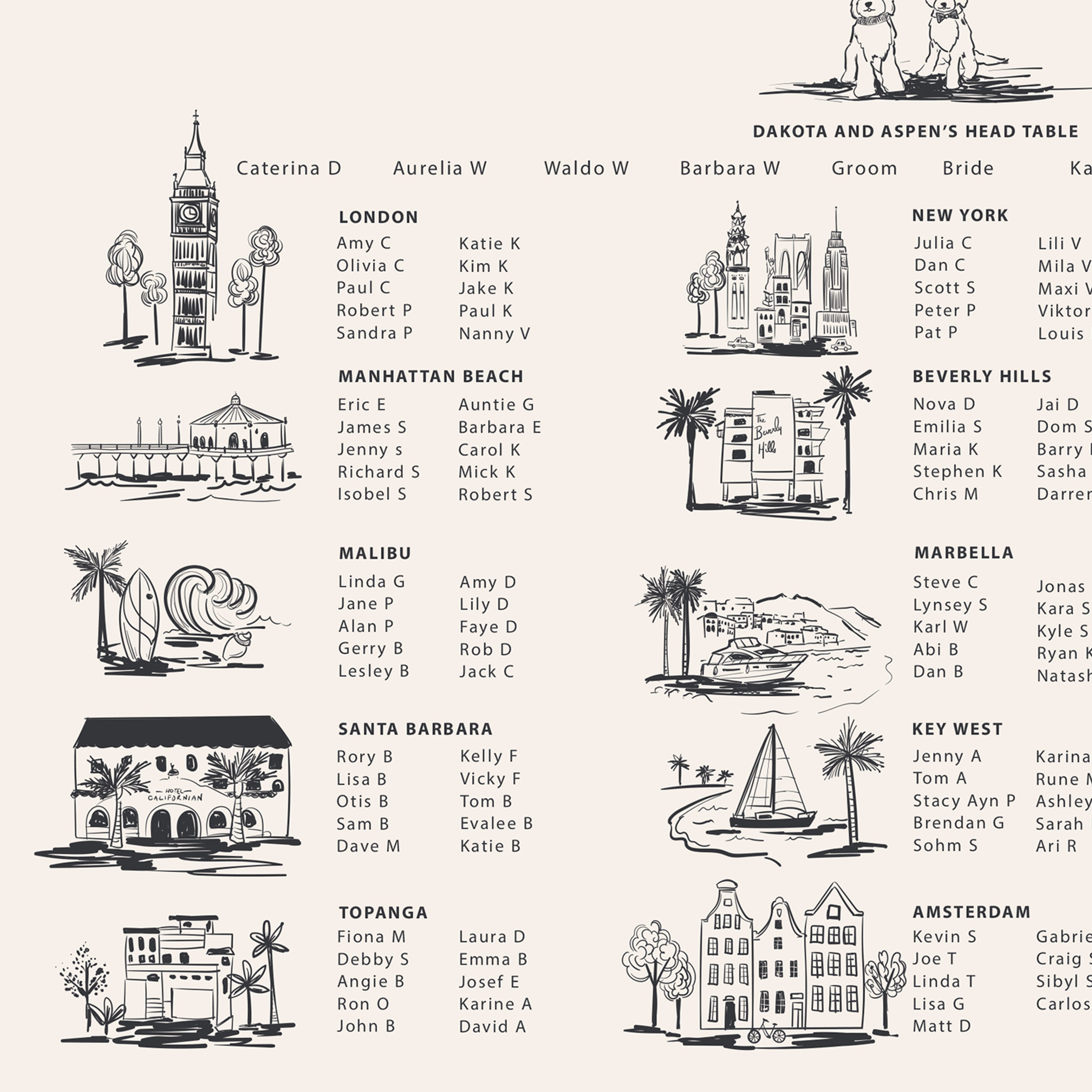 Invitations, Welcome Signs, Table Plans, Illustrated Timelines, Placenames and more..