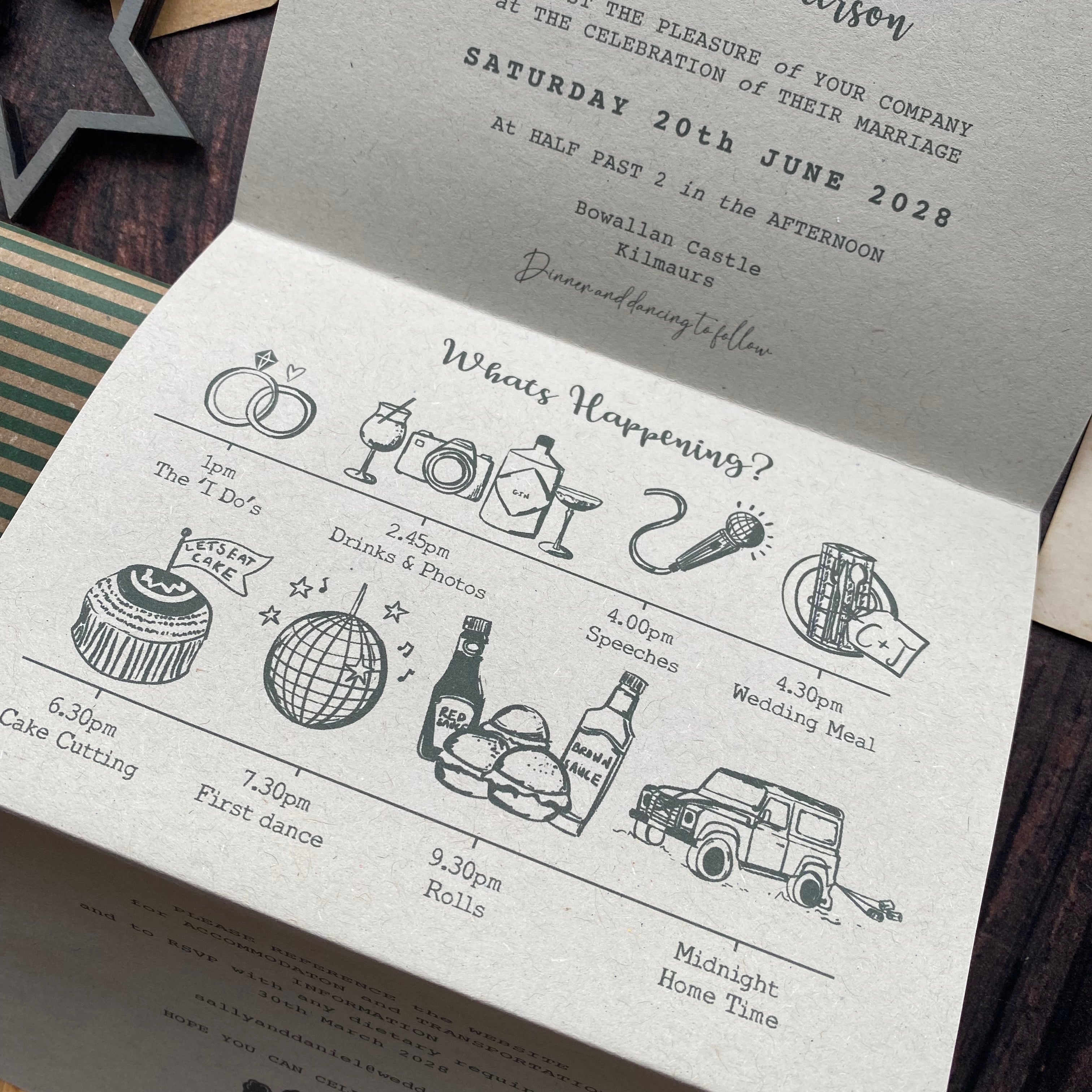 4 Fold Invitation Printed on beautiful recycled paper. Matching stationery available.